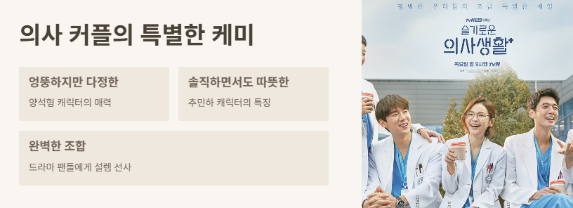 이 커플의 결혼 설정은 단순히 팬 서비스 차원이 아니다. 슬의생이라는 작품의 정서적 연장선에서 매우 중요한 감정선으로 기능한다. 시청자들은 이 설정을 통해 일상의 무게 속에서도 따뜻한 위로를 받는 것이다.