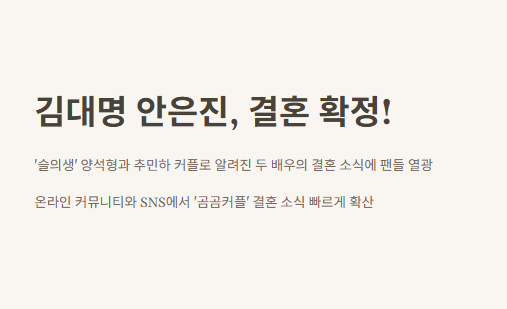 결혼 이슈로 다시 주목받는 이 시점에서, 두 배우의 커리어도 함께 관심을 받고 있다. 김대명은 ‘협상의 기술’을 통해 또 다른 인생 캐릭터를 경신 중이며, 안은진은 ‘나쁜엄마’, ‘연인’, ‘종말의 바보’까지 이어지는 활약으로 대중성과 연기력을 모두 인정받고 있다.