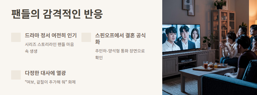 스핀오프 드라마 속에서 등장한 “여보, 겉절이 추가해줘”라는 대사. 단순한 말 같지만, 팬이라면 이 장면의 무게를 이해하실 거예요. 감정이 쌓인 인물의 삶을 단 한 문장으로 압축해낸 순간이었죠. 저도 그 장면을 보고 있다가 괜히 울컥했어요. 드라마지만, 누군가의 삶이 이만큼 따뜻할 수 있다는 것이 희망처럼 느껴졌거든요.