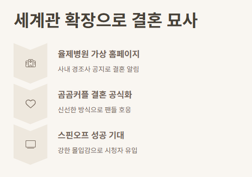 제작진이 율제병원 가상의 공식 홈페이지에 “[사내 경조사] 곰곰커플 드디어 결혼?!”이라는 공지를 올리며, 세계관 내에서 김대명 안은진 결혼을 알리는 방식 역시 신선했다. 기존 팬들뿐만 아니라, 새로운 시청자들에게도 이들의 스토리가 강한 몰입감을 주며, 스핀오프 드라마의 성공을 기대하게 만든다.