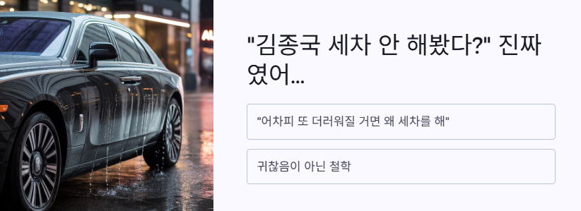 방송 보면서 처음에 "세차를 한 번도 안 해봤다"는 말에, 나도 모르게 "엥?" 했거든? 근데 김종국은 진짜 진심이더라. 그냥 귀찮아서가 아니라 철학이랄까? “어차피 또 더러워질 거면 왜 세차를 해”라는 마인드. 솔직히 나도 공감됐어. 나도 방 청소해봤자 하루 만에 다시 난장판 되는데…ㅋㅋ