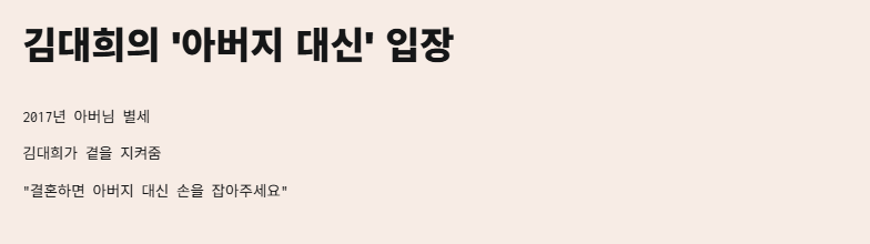 A. 김지민 씨가 부탁한 대로 김대희 씨가 아버지 대신 신부 손을 잡고 입장해 큰 감동을 주었죠.