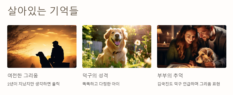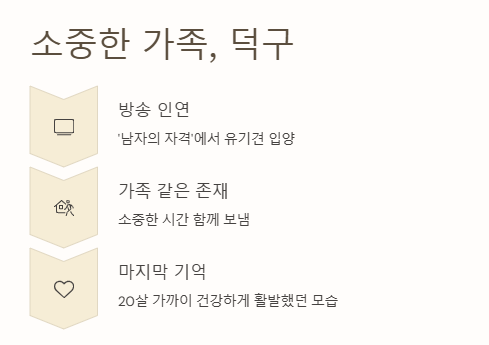 덕구가 떠난 지 2년이 지났지만, 그 기억은 여전히 살아있다. 강수지는 영상에서 “덕구는 참 똑똑하고 다정한 아이였어요. 아직도 덕구 생각을 하면 울컥해요”라고 말했다. 김국진 역시 덕구의 존재를 언급하며, 그리움을 내비쳤다.