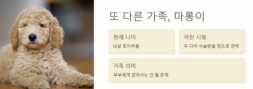 현재 ‘마롱이’라는 토이푸들을 키우고 있으며, 나이는 13살입니다.