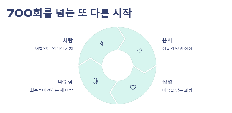 이제 ‘한국인의 밥상 최수종’이라는 이름 아래, 프로그램은 또 다른 700회를 향해 천천히 걸음을 내디딜 것이다. 세대는 바뀌었지만, 사람과 음식, 정성과 따뜻함은 여전히 그대로다. 그리고 그 중심에는 배우 최수종이라는 새 바람이 부드럽게 자리하고 있다.