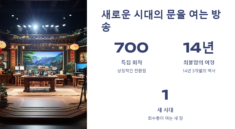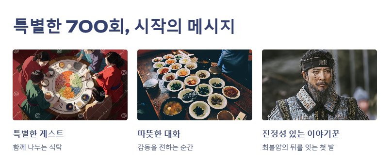 KBS1이 야심차게 준비한 700회 특집은 그 자체로 상징성이 크다. 무려 14년 3개월 동안 이어져온 방송의 흐름 속에서, 최불암의 퇴장은 하나의 역사적 장면이며, ‘한국인의 밥상 최수종’이라는 새로운 구절은 그 뒤를 잇는 새로운 시대의 문을 여는 열쇠다.