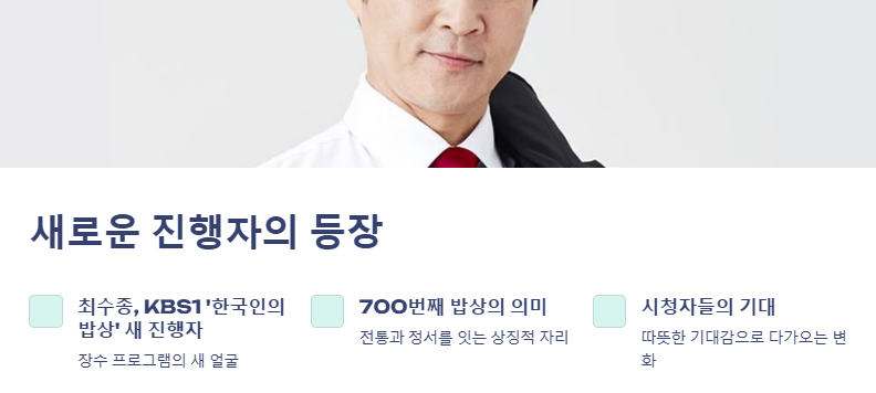 배우 최수종이 KBS1 장수 프로그램 '한국인의 밥상'의 새로운 진행자로 나선다. 그가 처음으로 차리는 700번째 밥상은 단순한 방송을 넘어서, 한 세대가 이어온 전통과 정서를 다음 세대로 잇는 상징적인 자리가 되었다. ‘한국인의 밥상 최수종’이라는 키워드는 이제 따뜻한 기대와 함께 시청자들에게 다가가고 있다.