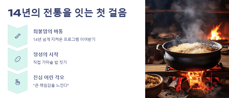 최불암이라는 거목이 14년 넘게 지켜온 프로그램의 바통을 이어받은 최수종은, 자신의 첫 회차를 맞아 많은 준비를 거쳤다. 그는 촬영장에서 직접 가마솥 밥을 짓고, 정성으로 밥상을 차리며 새로운 시작에 대한 각오를 전했다. “큰 책임감을 느낀다. 앞서 걸어가신 최불암 선생님의 길을 따라가겠다”는 말에서 그의 진심이 느껴진다.