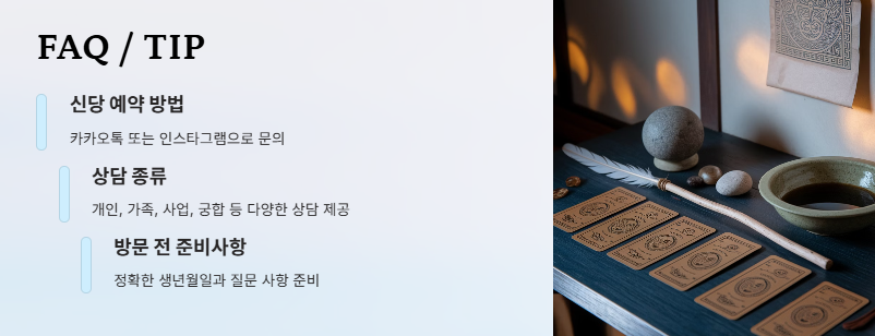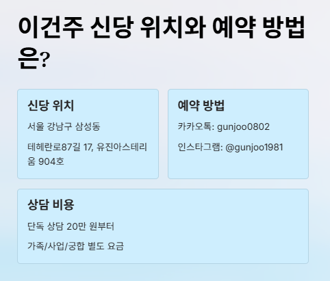 예약은 카카오톡(gunjoo0802) 또는 인스타그램(@gunjoo1981)을 통해 가능하며, 단독 상담은 20만 원부터 시작된다. 가족 상담이나 궁합, 사업 관련 점사는 각각 다른 요금이 적용된다.