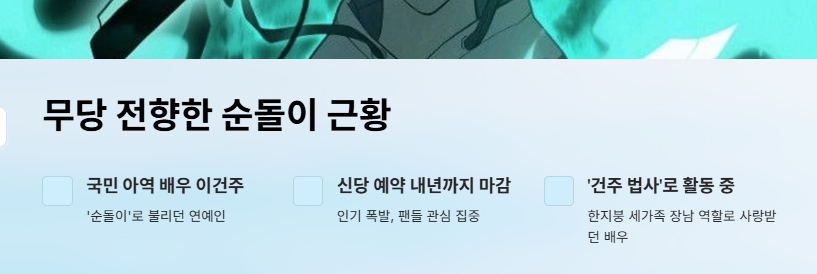 1980년대 국민 아역 배우였던 '순돌이' 이건주가 최근 무속인으로 전향해 화제를 모으고 있다. 강남 삼성동에 신당을 차리고 활동 중이며, 신내림 계기와 현재 점집 위치, 예약 방법까지 공개되며 주목받고 있다.