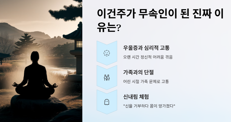 이건주 신당이 주목받는 이유 중 하나는 그가 무속인이 된 배경이 매우 극적이기 때문이다. 오랜 시간 우울증과 심리적 고통을 앓았던 그는 결국 신내림을 받게 되었다. 특히 어린 시절 가족과의 단절, 학창시절의 외로움 등이 무속인의 길을 걷게 만든 계기로 작용했다.