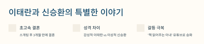 배우 이태란의 남편으로 알려진 벤처사업가 신승환과의 특별한 연애·결혼 이야기는 많은 사람들의 궁금증을 자극해요. 빠른 결혼 결정, 성격 차이 속 갈등, 그리고 결국엔 서로를 이해하며 이뤄낸 부부의 유대까지. 이 글에서는 이태란의 실제 발언과 방송 내용을 중심으로 그들의 진짜 이야기를 정리해볼게요.