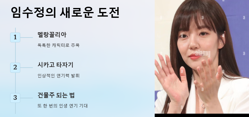 임수정은 드라마 ‘멜랑꼴리아’, ‘시카고 타자기’ 등에서 독특한 캐릭터로 주목받은 바 있으며, 이번 작품을 통해 또 한 번의 인생 연기를 펼칠 것으로 기대됩니다. 특히, 부드러운 이미지 속 숨겨진 강단 있는 내면을 표현하는 데 있어 임수정은 타의 추종을 불허하는 연기력을 가진 배우입니다.