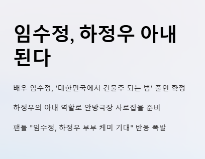 ‘임수정 하정우 아내 된다’는 문장은 팬들의 관심을 자극하는 핵심 문구로, 드라마 내 중심축 역할을 함축적으로 드러내는 표현입니다.