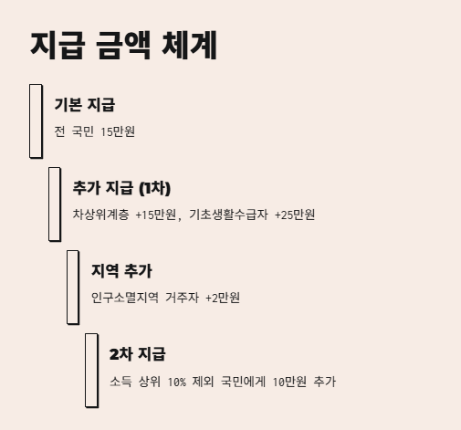 민생회복 소비쿠폰 신청하면 받을 수 있는 금액이 생각보다 다양하더라고요. 기본적으로 모든 국민이 받을 수 있는데, 소득과 지역에 따라서 추가 금액까지 받는 구조예요.