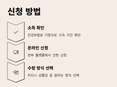 - 지급방식: 지역사랑상품권, 선불카드, 신용·체크카드 중 선택 가능