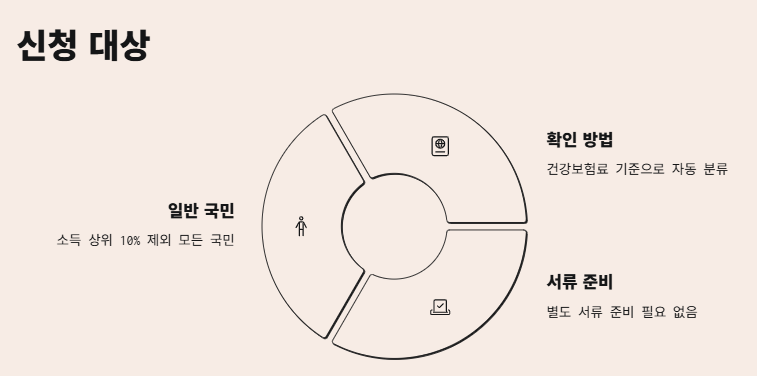 친구들이 제일 많이 물어본 질문! 민생회복 소비쿠폰 신청 대상은 어떻게 되는지! 소득 상위 10% 빼고는 거의 다 받을 수 있어요. 건강보험료 기준으로 자동 분류라서 따로 서류 준비할 필요도 없음!