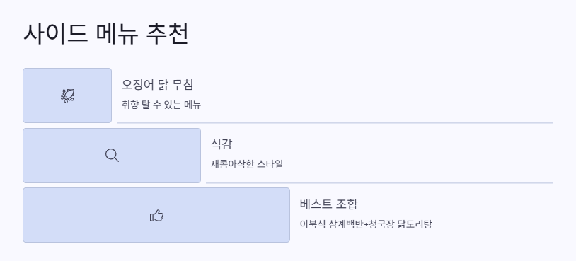사이드 메뉴 추천: 오징어 닭 무침은 취향 탈 수도 있음