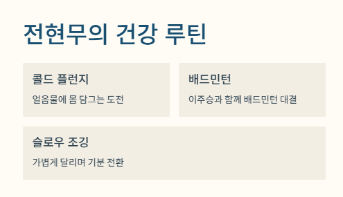 A1: 전현무는 콜드 플런지, 배드민턴, 슬로우 조깅 같은 다양한 건강 루틴을 도전했어.