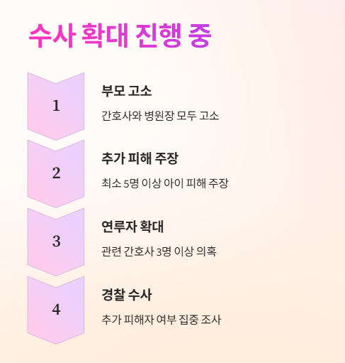 간호사는 업무에서 배제되었으며, 병원 측의 중징계 절차가 진행 중입니다. 경찰은 디지털 포렌식과 추가 수사를 병행하고 있습니다.