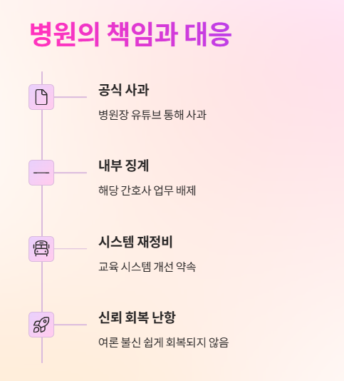 병원은 공식 사과문과 영상을 통해 사과하였고, 향후 재발 방지를 위한 교육 강화와 내부조사를 약속했습니다.