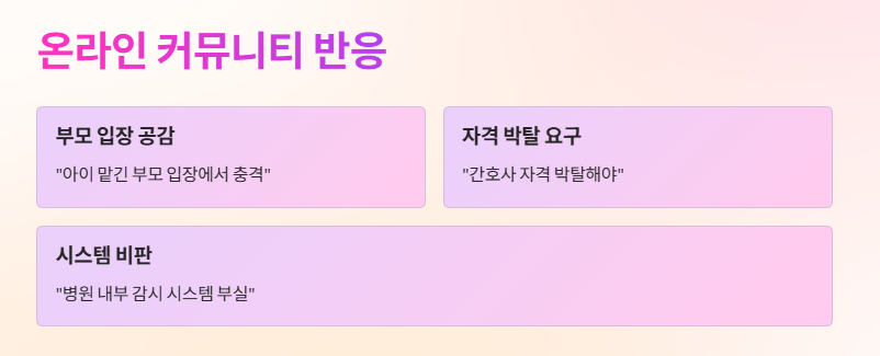 해당 사건은 각종 커뮤니티와 SNS에서도 폭발적인 반응을 얻고 있다. “아이를 맡긴 부모의 입장에서 충격”, “간호사 자격 박탈해야 한다”는 의견부터 “병원 내부 감시 시스템이 부실하다”는 지적까지 나오고 있다. ‘낙상 마렵다 간호사 압수수색’이라는 문장은 현재 온라인 상에서 가장 많이 회자되는 문장 중 하나다.