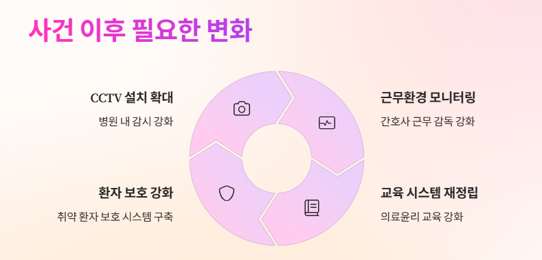 이번 사건은 모든 의료기관에 경각심을 주는 계기가 되었다. 앞으로 병원 내 CCTV 설치 확대, 간호사 근무 환경 모니터링 강화, 교육 시스템 재정립 등 실질적인 변화가 필요하다. ‘낙상 마렵다 간호사 압수수색’ 사건은 의료윤리 재정립을 위한 경고장이다.