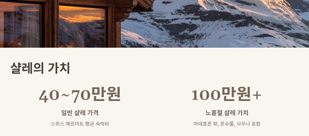 노홍철 샬레 가격이 따로 공개된 건 없지만, 주변 스위스 샬레 숙박비 검색해봤는데 보통 1박에 40~70만 원이래. 근데 노홍철 샬레는 거기에 마테호른 뷰, 온수풀, 사우나, 독립된 공간, 노홍철 감성까지 다 담겨 있으니까… 그 가치는 솔직히 백만 원 이상이라고 해도 과언 아님.