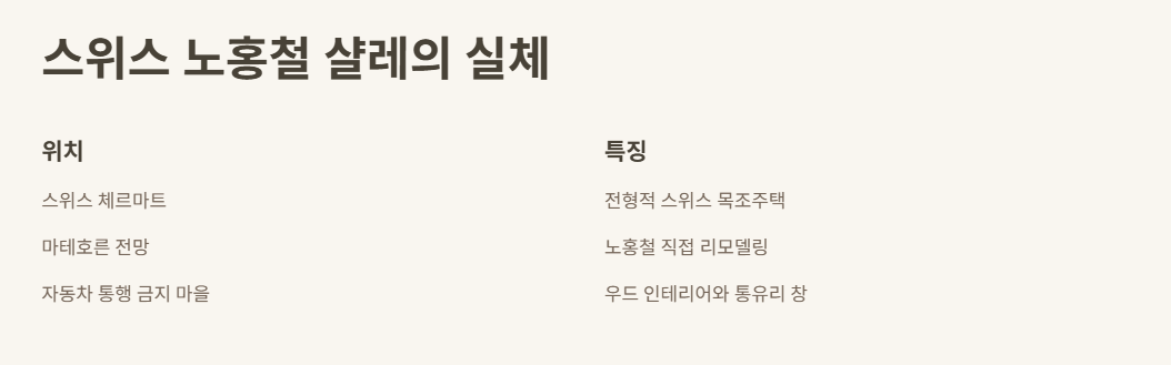 일단 노홍철 샬레 위치부터 말해줄게. 바로 스위스 체르마트! 체르마트는 마테호른 전망이 끝내주는 곳으로 유명하거든. 자동차 통행이 금지된 마을이라 공기도 넘나 맑고, 전기차랑 마차만 다녀서 분위기가 완전 동화 같아.
