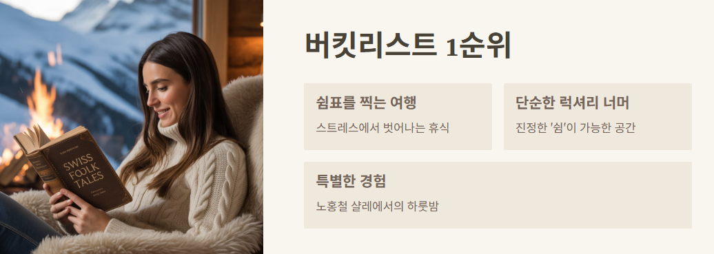 진짜 솔직히 말해서, 요즘 스트레스도 많고 쉬고 싶은 마음도 컸거든. 근데 이 샬레 보고 나니까 쉼표를 찍는 여행, 이게 딱 떠오르더라. 단순히 예쁘고 고급스러운 게 아니라, 진짜 ‘쉼’이 가능한 공간. 그래서 나의 버킷리스트 1위는 노홍철 샬레로 정함!