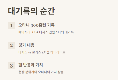 메이저리그 LA 다저스의 간판스타 오타니 쇼헤이가 드디어 ‘오타니 300홈런’이라는 대기록을 달성했다는 소식이 전해졌어요. 이번 글에서는 1. 오타니 300홈런 기록 달성 경기 내용 2. 팬들 사이 반응 및 현장 분위기 3. 오타니 연봉과 가치 상승까지 다루어볼게요.