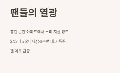 이번 시즌 초에만 해도 연봉 얘기 많이 나왔는데, 이번 오타니 300홈런으로 또다시 팬들 사이에서도 “연봉값 한다!”는 말이 많아졌어요. 진짜 살아있는 레전드 같아요.