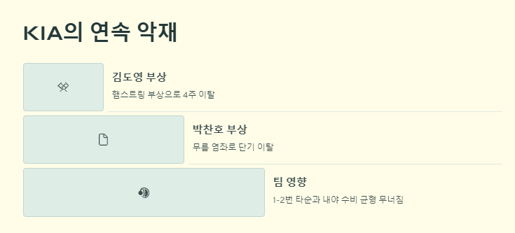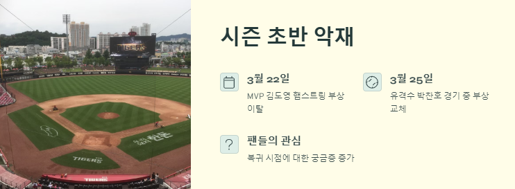 KIA 타이거즈 시즌 초반 주전 연쇄 부상 속 위기감 고조