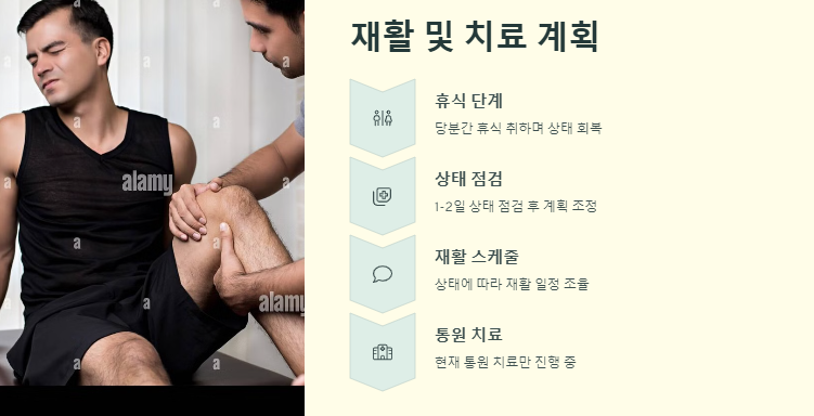 박찬호는 당분간 휴식을 취하면서 무릎 상태를 회복할 예정이다. KIA 구단은 하루 또는 이틀 정도 상태를 점검한 뒤 재활 스케줄을 조정할 계획이다. "박찬호 부상 상태 및 복귀 일정 정리"와 관련하여 현재 재활치료는 통원 치료로만 진행 중이다.