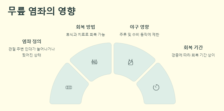 염좌는 관절 주변의 인대가 늘어나거나 약간 찢어진 상태를 말한다. 통상적으로 무릎 염좌는 휴식과 치료로 충분히 회복 가능하지만, 야구선수의 경우 주루 및 수비 동작에서 영향을 줄 수 있다. 이 때문에 "박찬호 부상 상태 및 복귀 일정 정리"에 관심이 쏠리고 있는 것이다.