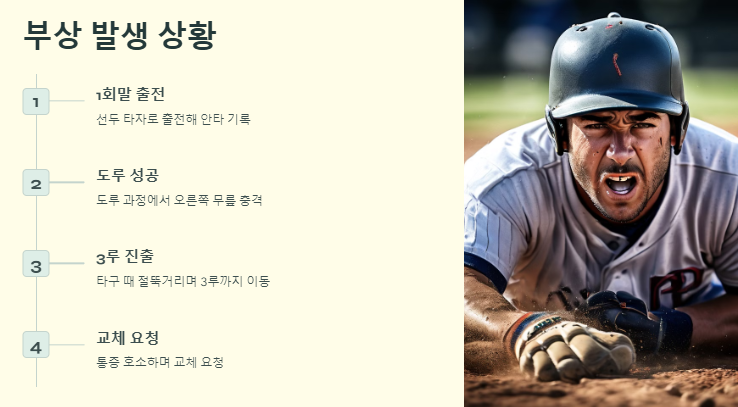 박찬호는 1회말 선두 타자로 출전해 안타를 기록하고 도루에 성공했다. 하지만 도루 과정에서 오른쪽 무릎에 충격을 받아 이후 타자의 타구 때 절뚝거리며 3루까지 이동한 뒤, 통증을 호소하며 교체를 요청했다. "박찬호 부상 상태 및 복귀 일정 정리"에 따르면 이 시점이 결정적 순간이었다.