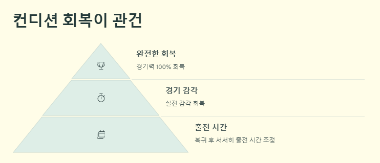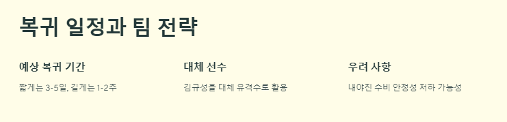 박찬호가 단순히 출전이 가능한 상태가 되는 것보다, 경기 감각과 컨디션을 완전히 회복하는 것이 중요하다. "박찬호 부상 상태 및 복귀 일정 정리"에 따라 복귀 후에도 서서히 출전 시간을 조정할 가능성이 크다.