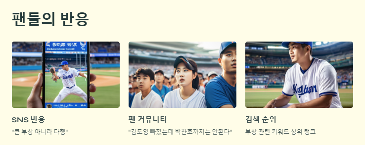SNS와 팬 커뮤니티에서는 박찬호의 부상 소식을 접한 팬들이 “큰 부상이 아니라 다행이다”, “김도영 빠졌는데 박찬호까지는 안된다”는 반응을 보이고 있다. "박찬호 부상 상태 및 복귀 일정 정리" 키워드는 검색 순위 상위에 오르며 팬들의 관심을 입증하고 있다.