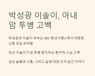 박성광과 이솔이 부부는 SBS ‘동상이몽2’에 출연하면서 대중에게 따뜻한 신혼의 모습을 보여준 바 있다. 하지만 최근, 박성광의 아내 이솔이가 충격적인 사실을 고백했다. 바로 암 투병 중이라는 것이다. 이솔이는 SNS를 통해 오랜 시간 숨겨왔던 자신의 이야기를 꺼냈고, 그 안에는 깊은 슬픔과 고통, 그리고 그럼에도 불구하고 삶에 대한 의지가 가득 담겨 있었다.