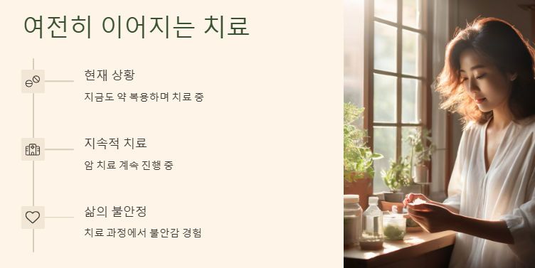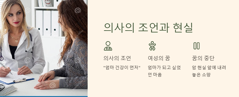 의사에게 “아이를 가질 수 있을까요?”라고 물을 때마다 “엄마 건강이 먼저”라는 말을 듣는 현실. 여성으로서의 꿈, 엄마가 되고 싶었던 마음은 암이라는 현실 앞에서 잠시 내려놓아야 했다.