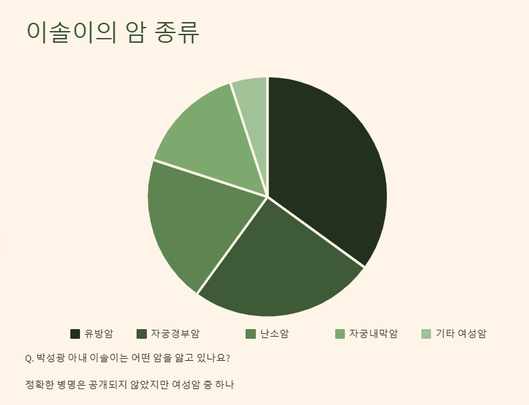 그녀는 퇴사 후 자연스럽게 아이를 준비하던 중, 5개월 만에 암 판정을 받았다고 밝혔다. 당시 이솔이는 여성암이라는 특수한 암 판정을 받았고, 그로 인해 아이를 가질 수 없는 상황에 놓였다. “박성광 아내 이솔이 암 투병 중”이라는 소식은 단순한 뉴스가 아닌, 한 여성이 겪고 있는 현실적인 아픔을 담고 있다.