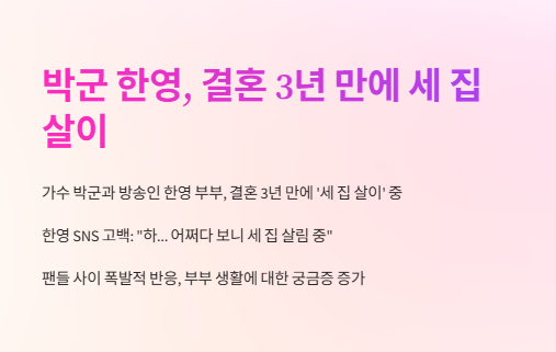 특히 박군은 과거 “집을 살 때 정확히 반반 부담했다”고 밝힌 바 있다. '박군 한영 세 집 살림'이라는 구문은 이들의 재정적 독립성과 책임감을 보여주는 대목이기도 하다.