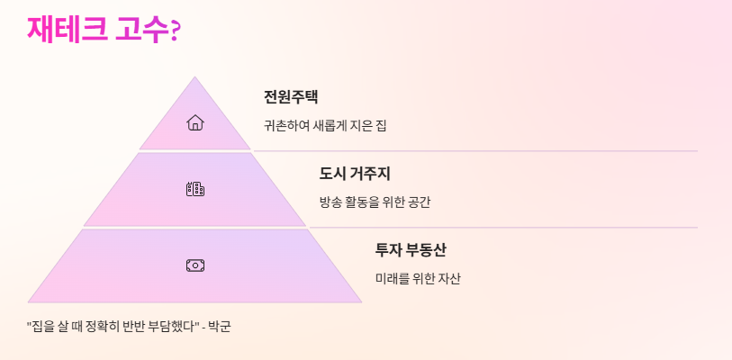 한 채는 귀촌하여 새롭게 지은 전원주택, 또 다른 한 채는 방송 활동을 위한 도시 거주지, 나머지 한 채는 투자 목적의 부동산일 가능성도 있다.