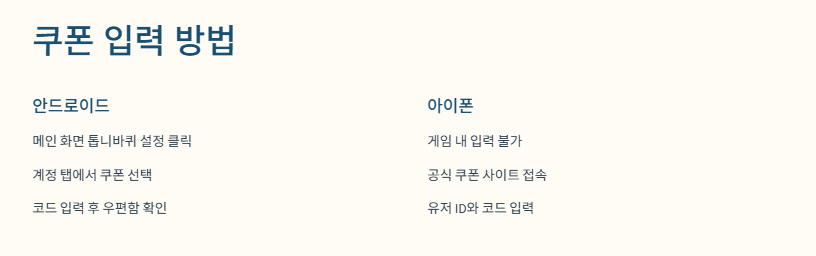 아이폰의 경우, 게임 내 쿠폰 입력이 불가능하므로, 외부 사이트를 통해 쿠폰을 등록해야 합니다.