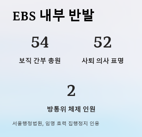 2025년 3월, 신동호 EBS 사장 임명 소식이 전해지자 EBS 내부는 즉각 반발에 나섰습니다. 보직 간부 54명 중 무려 52명이 사퇴 의사를 밝혔고, EBS 노조 역시 임명 절차의 적법성 문제를 제기했습니다.