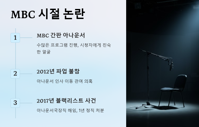 이후 2017년 MBC 블랙리스트 사건에서 중심 인물 중 하나로 지목되며 아나운서국장직에서 해임되었고, 1년간의 정직 처분을 받은 바 있습니다. 이 사건은 당시 언론계 내부 갈등을 적나라하게 보여주는 상징적 사례로 남아 있습니다.