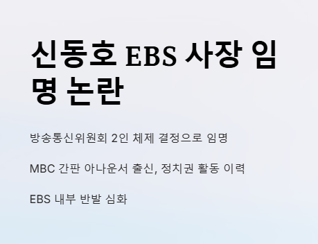 이러한 질문들이 포털 검색창에 오르내리는 지금, 대중의 관심은 단지 한 사람의 임명을 넘어서 공영방송의 미래와 연결되어 있습니다. 신동호 EBS 사장의 앞날이 어떤 방향으로 흐를지는 지켜볼 문제입니다.