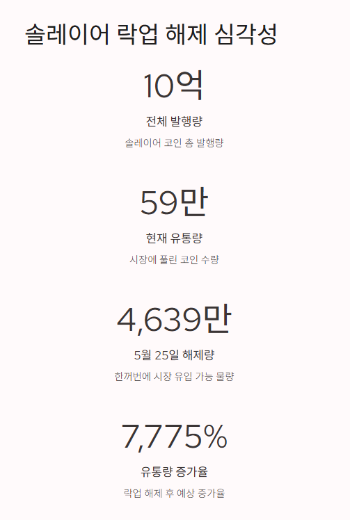 제가 조사해봤는데, 현재 솔레이어 코인의 전체 발행량은 무려 10억 개래요. 근데 지금 유통 중인 건 59만 개 정도밖에 안 된대요. 그런데! 5월 25일에 무려 4,639만 개가 한꺼번에 시장에 풀릴 수 있다는 거예요. 이건 단순 계산해도 7,775% 증가라는 말이더라고요. 헉 소리 나죠 진짜...