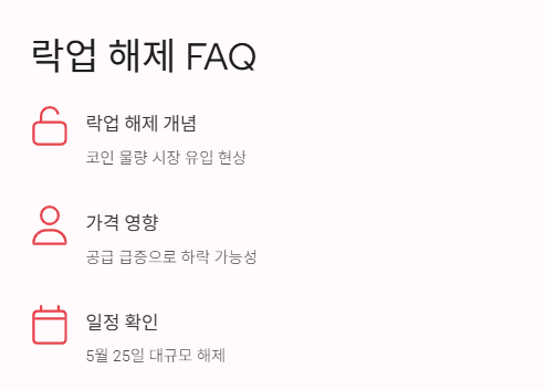→ 코인 락업 해제는 대량 물량이 시장에 풀리는 구조로, 가격 하락에 직접적인 영향을 주는 주요 변수입니다.