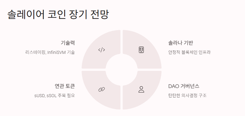 지금은 하락장이라 불안하지만, 솔레이어는 기술력도 있고, 솔라나 기반이라서 성장 가능성이 커요. 리스테이킹, InfiniSVM 기술, DAO 거버넌스까지 탄탄하게 갖추고 있고, 장기적으로는 주목할 만한 코인이라고 생각돼요. 특히, sUSD나 sSOL 같은 연관 토큰도 같이 주목하면 좋을 것 같아요.